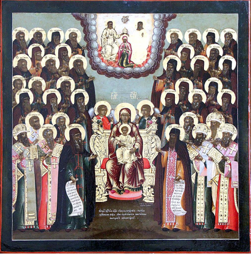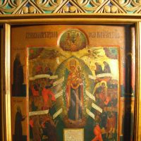 Краткое описание: в центре – изображение сидящей на престоле Богоматери с Младенцем, благословляющим обеими руками. За пре столом – два ангела. По сторонам Богоматери предстоят преподобные Антоний и Феодосий и расположенные в семь ярусов святые Киево Печерского монастыря. Вверху, в «облачном» сегменте, изображена сцена «Коронования Богоматери».