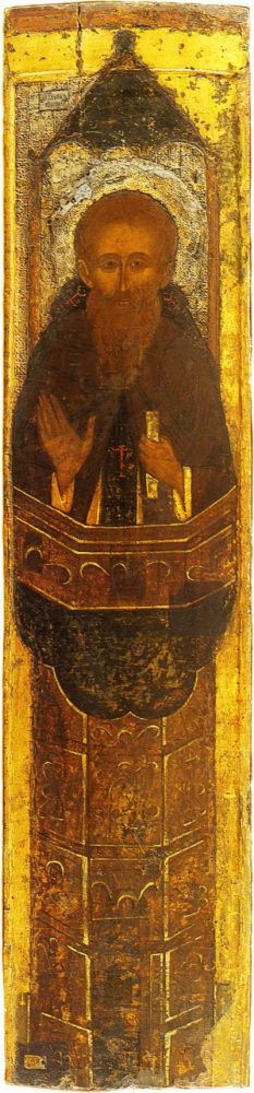 Терпения столп был еси, / ревновавый праотцем, преподобне,/ Иову во страстех, Иосифу во искушениих, / и Безплотных жительству / сый в телеси, Данииле, отче наш, / моли Христа Бога спастися душам нашим,