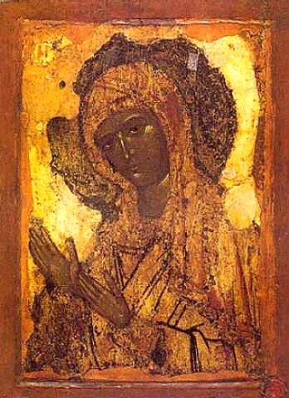 Халкопратийская икона (Святорачица, Агиосоритисса) — один из типов изображения Пресвятой Богородицы без Младенца, обычно в повороте три четверти с молитвенным жестом рук. Известен по ряду византийских источников не позднее IX—X вв., получил широкое распространение в византийском искусстве XII—XV вв. Иконографически восходит к деисусной композиции, где Богородица обращается к Христу с молением (греч. деисис) за род человеческий, отсюда ещё одно именование — Заступница. Изображения Божией Матери из деисуса исследователи также относят к типу Агиосоритисса. В греческой традиции подобные иконы именуются Параклесис (Просительница), чаще всего (особенно в искусствоведении) этот эпитет присвоен изображениям Богородицы, держащей в руках свиток с текстом Своего моления к Сыну. Один из видов икон, представляющих Богородицу Параклесис (Агиосоритиссу) в русской иконописи получил название Боголюбская (по имени князя Андрея Боголюбского), которому по легенде явилась Богоматерь со свитком в правой руке и с левой рукой, простёртой на молитву к видимому на возду?хе Христу. Подлинная икона, находящаяся во Владимире, считается чудотворной. На таких иконах «восстанавливается» деисусная композиция, к части которой восходит икона Агиосоритиссы: Богородица представлена стоящей в рост, в молитвенном обращении к Своему Сыну, изображаемому в небесном сегменте в верхнем углу. К ногам Божией Матери припадает святой Андрей Боголюбский, а также часто и дополнительно избранные персонажи, число и состав которых чрезвычайно различен в разных изводах. На Боголюбской иконе Богородица изображается в роли заступницы и посредницы, но присутствуют и идеи композиций Оранты и Одигитрии, указывающей Путь припадающим. На изображении приведена Халкопратийская икона византийского происхождения из центрального иконостаса Успенского собора Московского Кремля.