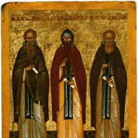 Главная > Иконы > Новгород, Новгородский гос. историко-архитектурный и худо­жест­вен­ный музей-заповедник, Россия > Харитон Исповедник, Варлаам Хутынский и Сергий Радонежский