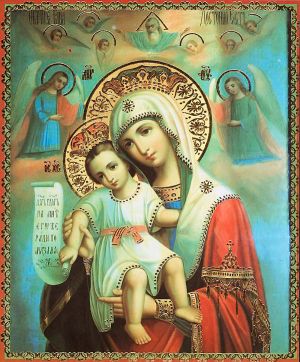 Икона Божией Матери «Достойно есть», иначе называемая «Милующая», – древний чудотворный образ с Афона. В Х веке близ монашеского поселения Карея на Афоне жили старец с послушником. Однажды старец отправился ко всенощной в храм, а послушник остался дома читать молитвы перед иконой Пресвятой Богородицы. Внезапно в келью вошел незнакомый молодой монах и стал молиться вместе с хозяином. Когда пришло время петь величание Пресвятой Богородице: «Честнейшую херувим и славнейшую без сравнения серафим, без истления Бога Слова рождшую, сущую Богородицу Тя величаем», – гость сказал, что там, откуда он пришел, Божью Матерь славят не так. Прежде чем петь «Честнейшую херувим…» добавляют слова: «Достойно есть яко воистину блажити Тя Богородицу, присноблаженную и пренепорочную, и Матерь Бога нашего». Гость велел записать эту молитву и впредь молиться только так. В келье не было письменных принадлежностей, тогда гость написал слова молитвы на камне, поверхность которого внезапно стала мягкой, как воск. Послушник рассказал всё старцу, и тот понял, что гостем был сам архангел Гавриил. Вскоре весть о произошедшем дошла до патриарха Константинопольского, и тот распорядился повсеместно петь величание Пресвятой Богородице так, как велел архангел, а икону, перед которой произошло чудо, перенесли в Успенский собор в Карее и стали почитать как чудотворную.