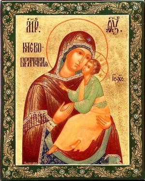 Киево-Братская икона Божией матери — одна из древних святынь Киевской земли, ныне, к сожалению, утраченная. Икона чудесным образом явилась в 1654 году в Вышгороде Киевском и находилась вБорисоглебской церкви. Во время войны с Польшей (1659-1667)церковь была разорена крымскими татарами, которые воевали в союзе с поляками, а икону, чтобы спасти от поругания, пустили по Днепру.Через некоторое время ее прибило к берегу возле Киева, и она с почестями была перенесена в Киево-Братский монастырь, где и стояла более двух столетий. После разрушения Киево-Братского монастыря в 1935 году икона исчезла. Ее точная копия находится в Киевском Покровском монастыре.