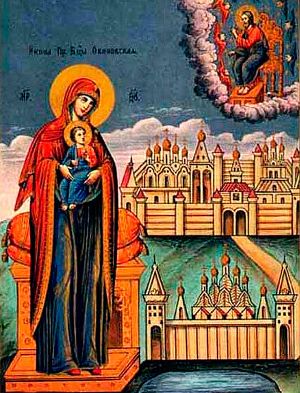 Овиновская икона Пресвятой Богородицы «Успение» – одна из древних чтимых икон с загадочной судьбой. Несмотря на свое название, она не является иконой Успения. На иконе Пресвятая Богородица изображена во весь рост, с Младенцем на руках, на фоне города, а с небес Ее благословляет Господь. Вероятно, изначально икона была двусторонней, и изображение Успения было утрачено. Икона была обретена в 1425 году. Боярин Иван Овинов решил благоустроить Николаевский монастырь, стоявший на берегу Галичского озера. По дороге к месту, где он хотел выстроить новый храм взамен ветхого, ему повстречались два ангела с образом Божией Матери. Они отдали икону боярину и велели построить храм с двумя приделами — в честь Успения Пресвятой Богородицы и святителя Николая. После этого обитель переименовали в честь иконы в Успенскую (ныне — Паисиево-Галичский Успенский монастырь). В 1433 году великий князь Василий Темный в ходе междоусобной войны захватил Галич и увез явленную икону в Москву. Однако неведомой силой она была перенесена обратно в монастырь.С тех пор образ стал особенно почитаться верующими и прославился многочисленными чудесами. Около 1449 года настоятель Успенского монастыря, преподобный Паисий Галичский, принес в Москву список Овиновской иконы. Ныне судьба иконы неизвестна. Возможно, она была утрачена еще в Смутное время. Перед революцией в Паисиево-Галичском монастыре находился ее чтимый список XVIII столетия. Ныне в монастыре хранится старинный список Овиновской иконы из Введенского собора города Галича, который не закрывался в советское время.