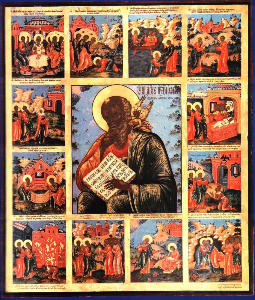 Иконы ИоаннаБогослова в житии являются редкостью. Еще более редки такие житийные иконыэтого святого, в среднике которых он изображается "в молчании" — сперстами, касающимися сомкнутых губ и с вдохновляющим его софийным ангелом (олицетворениемПремудрости). Икона является произведением иконописцев Ивана ИвановаБогданова (1716-1801 гг.) и Ивана Алексеева Богданова (1762-1835 гг.),крестьян-иконописцев из деревни Карбатово Чекуевской волости Онежского уезда.Иван Иванов Богданов был ведущим мастером среди иконописцев XVIII в.,работавших в Каргополье. Он возглавлял артель, создававшую иконостасы ирасписывавшую "небеса" деревянных церквей. Артель была лучшей в Каргопольеи Поонежье и исполняла все важнейшие художественные работы в этом регионе.Иван Алексеев Богданов был учеником Ивана Иванова и мастером данной артели.Известны произведения, подписанные ими совместно. Наличие подписи с ихименами и точной датой, при высоком качестве исполнения и хорошей сохранностииконы, делает ее выдающимся памятником иконописи русского Севера второйполовины XVIII в. Икона является очень значительной художественной,исторической и музейной ценностью