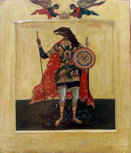 Краткое описание: святой изображён как «кинокефал» («псоглавец»). Он представлен в рост, в воинских доспехах, с копьём, мечом и щитом в руках. Ногами Христофор попирает скованного дьявола. На верхнем поле – два ангела, держащие над головой святого корону.