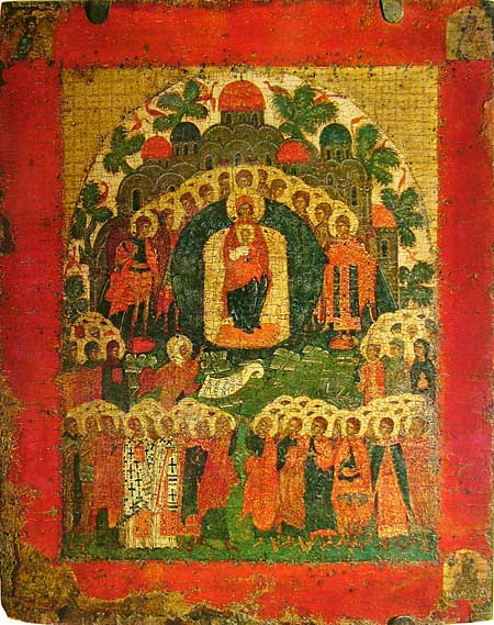 Свт. Николай Мирликийский, с Троицей Ветхозаветной, Явлением Богоматери Сергию Радонежскому и избранными святыми