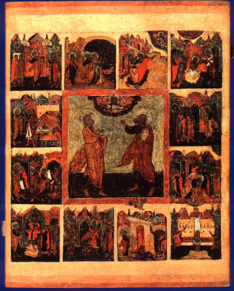 Главная > Иконы > Библиотекарь > Первоверховные апостолы Петр и Павел, с деяниями в 12 клеймах. 17 век
