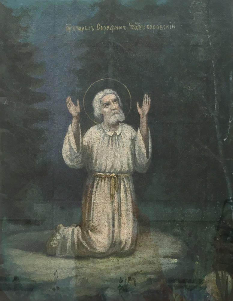 В расширении количества иллюстрируемых сюжетов отразилось постепенное осознание событий жизни святого и его духовных подвигов. Среди житийных сцен выделялось изображение редкого подвига столпничества — 1000 дней и ночей прп. Серафим молился на камне, стоя на коленях, днем в келье, ночью в лесу. Иногда этот сюжет писали на осколках подлинного камня, на котором молился святой. Образ на холсте из собрания Ф.Р. Комарова написан в конце XIX в., до канонизации святого, который назван в надписи «Пр. старец Серафим Чудотворец Саровский»: прп. Серафим, одетый в белый балахон, препоясанный кушаком, молится на камне в глухой лесной чаще на фоне темного неба. Впервые образ моления на камне появился среди акварелей П.Ф. Бореля, выполненных для экземпляра «Сказания о подвигах и событиях жизни старца Серафима…», предназначенного лично императрице Александре Феодоровне. Акварельные рисунки Бореля повторены в серии литографий мастерской П.Н. Шарапова в Москве в 1856 г. В печатном виде образ молитвенного подвига впервые появился в литографии В. Лукина 1848 г. в издании жизнеописания прп. Серафима (иеромонах Сергий Васильев). Живописный образ моления на камне находился в часовне над гробницей святого. Варианты композиции «Моления на камне» отличались деталями: положением рук святого, сложенными в крестное знамение или воздетыми в молитве вверх; на дереве инопца помещали икону Богородицы. На одной из литографии святой молился перед деревянным крестом. «Сказание о подвигах и событиях жизни старца Серафима…», составленное по воспоминаниям иеромонаха Иоасафа (Голстошеева), пользовалось большим успехом в Санкт- Петербурге и выдержало несколько изданий. Композиция публикуемого памятника отличается от ранних произведений незначительными деталями — фигура святого более выпрямлена, руки подняты вверх, напоминая древний жест оранта-молящегося. В деталях художник ориентировался на литографию «Ночное бдение на камне старца Серафима» из третьего издания «Сказания…» 1885 г.