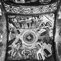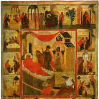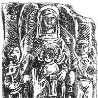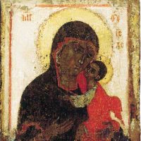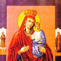 Слева на фоне архитектуры — стоящая Богоматерь, с посохом, за нею — апостолы Петр и Иоанн. Справа на фоне архитектуры — предстоящий ей преподобный Сергий, за ним — преподобный Никон. Вверху в темно-зеленой небесной сфере — изображенная монохромно Троица Ветхозаветная. На окладе имеется клеймо с датой — 1875 год. Памятник является характерным произведением мастерских Троице-Сергиева монастыря, писавших иконы «Сергиева видения» для продажи паломникам.