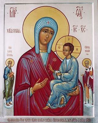 Икона получила такое необычное название, так как явилась святителю Филиппу митрополиту Московскому (память 22 января по новому стилю) во время молитвы, за печью в хлебопекарне Соловецкого монастыря в те времена, когда он, будучи иноком, исполнял в монастыре послушание пекаря. После мученической кончины святителя Филиппа в 1569 году от рук царского опричника Малюты Скуратова образ Богородицы «Хлебенная» стал одним из самых чтимых в Соловецкой обители и прославился во многих концах Святой Руси. В наши дни был написан список иконы Божией Матери «Хлебенная» для Успенского храма Санкт-Петербурга, построенного в память жертв блокады на месте массовых захоронений горожан, умерших и погибших в эти страшные годы. Он так и называется в народе – «блокадный». Образ написала на серебре преподаватель Санкт-Петербургской Духовной Семинарии иконописец Валентина Жданова. На иконе Божией Матери предстоят апостол Иоанн Богослов и святитель Николай Чудотворец.