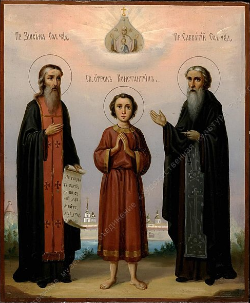 Икона. ЗОСИМА И САВВАТИЙ СОЛОВЕЦКИЕ, ОТРОК КОНСТАНТИН. Иконописцы В. Носов, М. Кичин, В. Чуев. 1915 г. Иконописная мастерская Соловецкого монастыря.