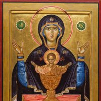 Царице наша Преблагая, надеждо наша, Пресвятая Богородице, приятелеще сирых и странных Заступнице, бедствующих помоще и озлобленных покрове. Зрише нашу беду, зрише нашу скорбь: отвсюду искушениями одержимы есмы, а заступающего несть. Ты убо Сама помози нам, яко немощны, окорми, яко странны, настави нас, яко заблудших, уврачуй и спаси нас, яко безнадежных. Не имамы иныя помощи, ни инаго предстательства, ни утешения, токмо Тебе, о Мати всех скорбных и обремененных. Призри на нас, грешных и во озлоблении сущих, покрый нас Честным Твоим Омофором. Да избавлени будем от зол, обышедших нас, наипаче же пиянства. Да восхвалим всегда Пресвятое имя Твое. Аминь.