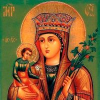 На иконе Пресвятая Богородица держит Своего Божественного Сына на правой руке, а в левой руке у Нее — цветок белой лилии. Этот цветок символически знаменует неувядаемый цвет девства и непорочности Пречистой Девы, к Которой так и обращается Святая Церковь: «Ты еси Корень девства и Неувядаемый Цвет чистоты».