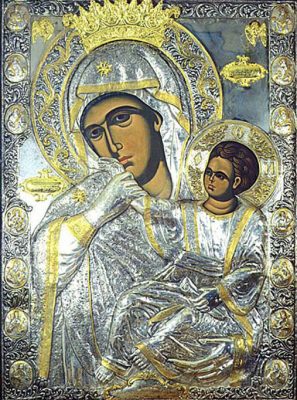 В то время, когда разбойники ждали открытия ворот, закончилась утреня и братия стала расходиться по кельям для временного отдыха. В церкви остался один настоятель монастыря. Вдруг от стоящей вблизи иконы Божией Матери он услышал женский голос, предупреждающий об опасности, грозившей монастырю. Игумен устремил свой взор на икону и увидел, что лики Богородицы и Богомладенца изменились. Ватопедская икона Божьей Матери была подобна «Одигитрии», на которой Богомладенец всегда изображается с благословляющей рукой.
