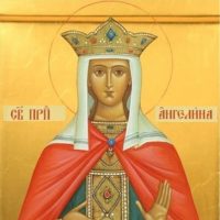 Дочь князя Георгия Албанского и супруга Стефана, короля Сербии, святая Ангелина претерпела изгнание вместе со своим мужем и разделила все трудности жизни в Албании и Италии. Двух сыновей своих, святых Максима и Иоанна, воспитала в духе истинно христианском. По смерти супруга, приняв монашеский постриг, святая Ангелина посвятила себя молитве, благотворительности и храмостроительству. Верная жена, добрая мать и совершенная христианка, она воистину заслужила имя «матери Ангелины», которым ее наградил народ. Ее чудотворные мощи сохраняются вместе с мощами ее праведного супруга — святого Стефана и их благочестивых детей Максима и Иоанна в монастыре Крушедол. Святая Ангелина обрела покой и вечную жизнь в начале шестнадцатого столетия.