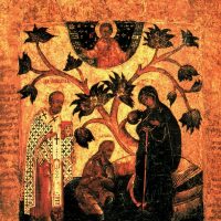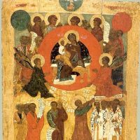 К вечеру святые апостолы сели за трапезу. Как было принято между ними, они оставили одно место не занятым, а пред ним положили кусок хлеба, чтобы после трапезы, творя благодарение Господу, прославляя имя Святой Троицы, этот кусок хлеба вкусить всем, как дар благословенный с молитвою: «Господи, Иисусе Христе, помогай нам!» Все думали и говорили за трапезой только о чудесном исчезновении тела Богородицы. Трапеза была окончена, все встали и по обычаю подняли хлеб, отложенный в честь Господа… Устремив вверх глаза, готовясь к молитве, все увидели Пречистую Деву Марию, окруженную множеством ангелов. И услышали от Нее: «Радуйтесь! Я с вами во все дни!».