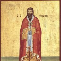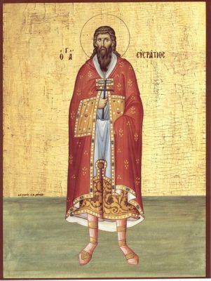 Святые мученики Евстратий, Авксентий, Евгений, Мардарий и Орест пострадали за Христа при императоре Диоклитиане (284 — 305) в Севастии, в Армении. В числе первых христиан, принявших тогда мучения, был пресвитер Аравийской церкви мученик Авксентий, заключенный в темницу. Видя непоколебимость христиан, градоправитель Саталиона, благородный военачальник святой Евстратий, бывший тайным христианином, решился на открытое исповедание веры, за что был подвергнут пыткам: его избивали, надевали на ноги железные сапоги, жгли огнем. После этих жестоких мучений его сожгли, а мученика Авксентия обезглавили. Увидев их мученическую смерть, святой Мардарий, который был из простого народа, также исповедал свою веру и был повешен вниз головой. Перед кончиной он произнес молитву: «Владыко Господи Боже, Отче Вседержителю…», которая читается в конце 3-го часа и на полунощнице. Мученику Евгению вырвали язык, отрубили руки и ноги и отсекли голову мечом. Молодой воин святой Орест исповедал себя христианином и за это предстал перед судом. Он был приговорен к сожжению на раскаленном железном ложе, куда взошел укрепляемый молитвой святого Евстратия. Предсмертная молитва святого Евстратия («Величая, величаю Тя, Господи…») читается на субботней полунощнице. Мученик Евстратий скончался 13 декабря.