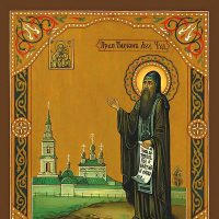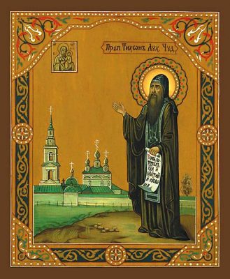 Преподобный Тихон Луховской, Костромской (в миру Тимофей), родился в пределах Литовского княжества и был там на военной службе. В 1482 году, не желая принимать униатство, он ушел из Литвы в Россию. Святой раздал все, что имел, принял постриг с именем Тихон и удалился в Костромскую епархию, в Луховские земли. Город Лух был отдан тогда князю Феодору Бельскому, вместе с которым преподобный Тихон пришел из Литвы. На берегу в урочище Копытовке преподобный Тихон поставил келлию. Когда к нему в пустыню пришли два инока, Фотий и Герасим, преподобный ради них перешел за три версты от Копытовки, на более удобное место. Подвижники добывали пропитание трудами рук своих. Преподобный Тихон искусно переписывал книги, был хорошим токарем. По смирению он так и не принял священства. Скончался преподобный Тихон 16 июня 1503 года, в такой бедности, что ученики не знали, в чем его погребсти. Но к их утешению Суздальский архиерей прислал подвижнику свитку, в которой его и предали земле. Вскоре после его смерти на месте его подвигов устроилась обитель в честь святителя Николая Чудотворца.