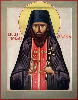 Священномученик Ювеналий, был в первой группе православных миссионеров на Аляске. В 1796 году география поездок миссионеров стала расширяться, захватывая не только острова, но и Аляскинский материк, куда и направился иеромонах Ювеналий и где был зверски убит племенем юпиков, вероятно, потому что они боялись незнакомцев. Это произошло около озера Илиамна. Когда шаман, или колдун этого племени, после убийства священномученика Ювеналия надел на себя его крест, он уже не мог совершить языческого обряда. Тогда он сказал своему племени, что в будущем следует с уважением относиться и прислушиваться к тем, кто носит такой знак, т.е. крест. Впоследствии это племя стало глубоко верующими православными христианами. В 1980 году о.Ювеналий был прославлен в лике священномучеников.
